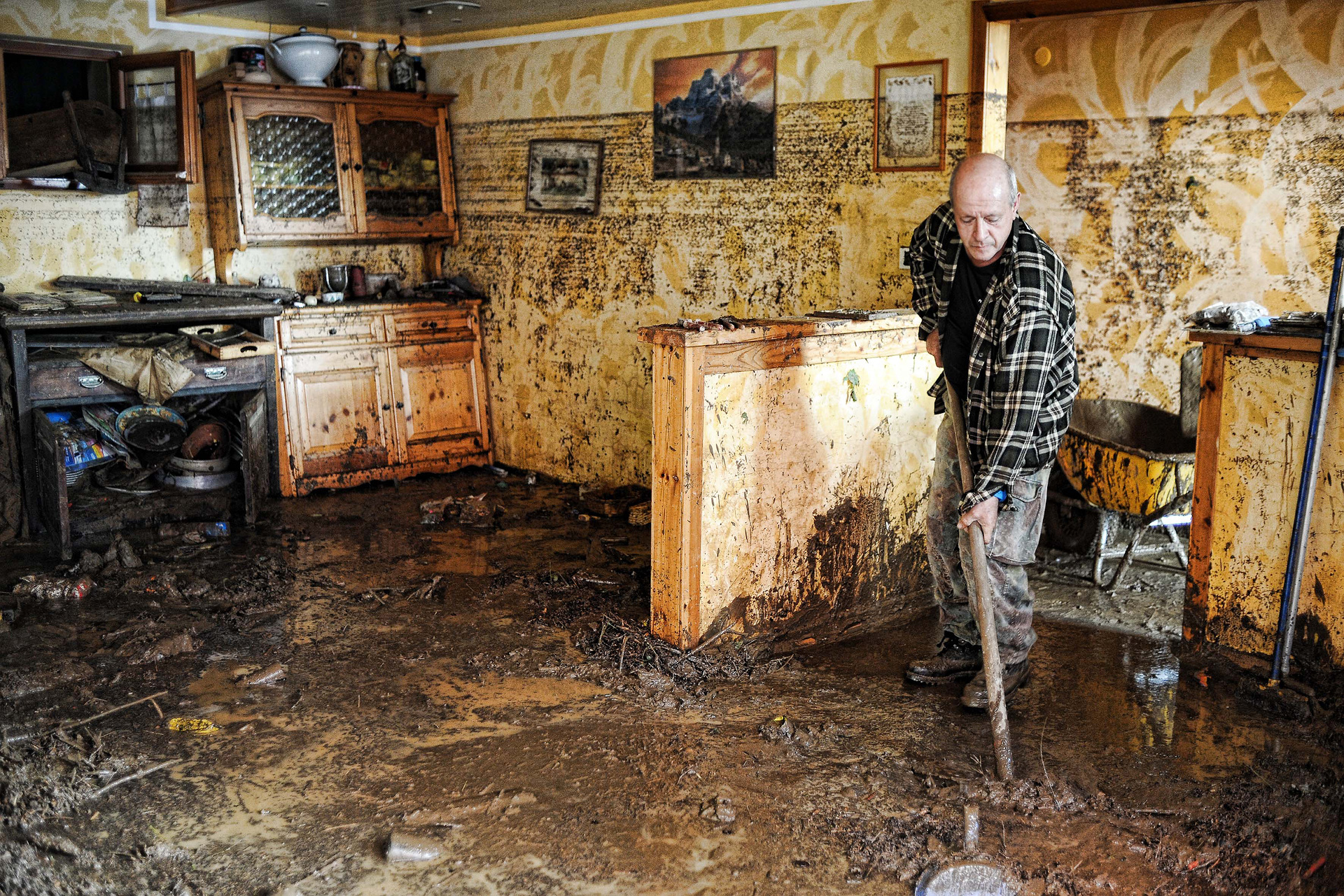 Il disastro causato dall’alluvione: a Borghetto Vara un uomo prova a rimuovere il fango dalla sua abitazione.
